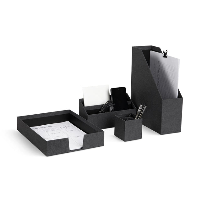 Dank der verschiedenen Elemente dieses Schreibtisch-Organizer-Sets haben Sie immer einen Platz für Dokumente, Stifte, Zeitschriften und andere Büromaterialien. Alles bleibt geordnet und griffbereit.