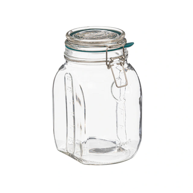Dieses großzügig bemessene Einmachglas besteht aus robustem Kalk-Natron-Glas, das temperaturbeständig und sterilisierbar ist. Es verfügt über integrierte Liter- und Unzen-Skalen, einen ergonomischen Silikondichtring mit Lippe zum mühelosen Öffnen und eine praktische Aussparung im Glas für den sicheren Halt des Metallbügels. Die flachen Seiten ermöglichen ein einfaches und effizientes Stapeln mit Gläsern anderer Größen.