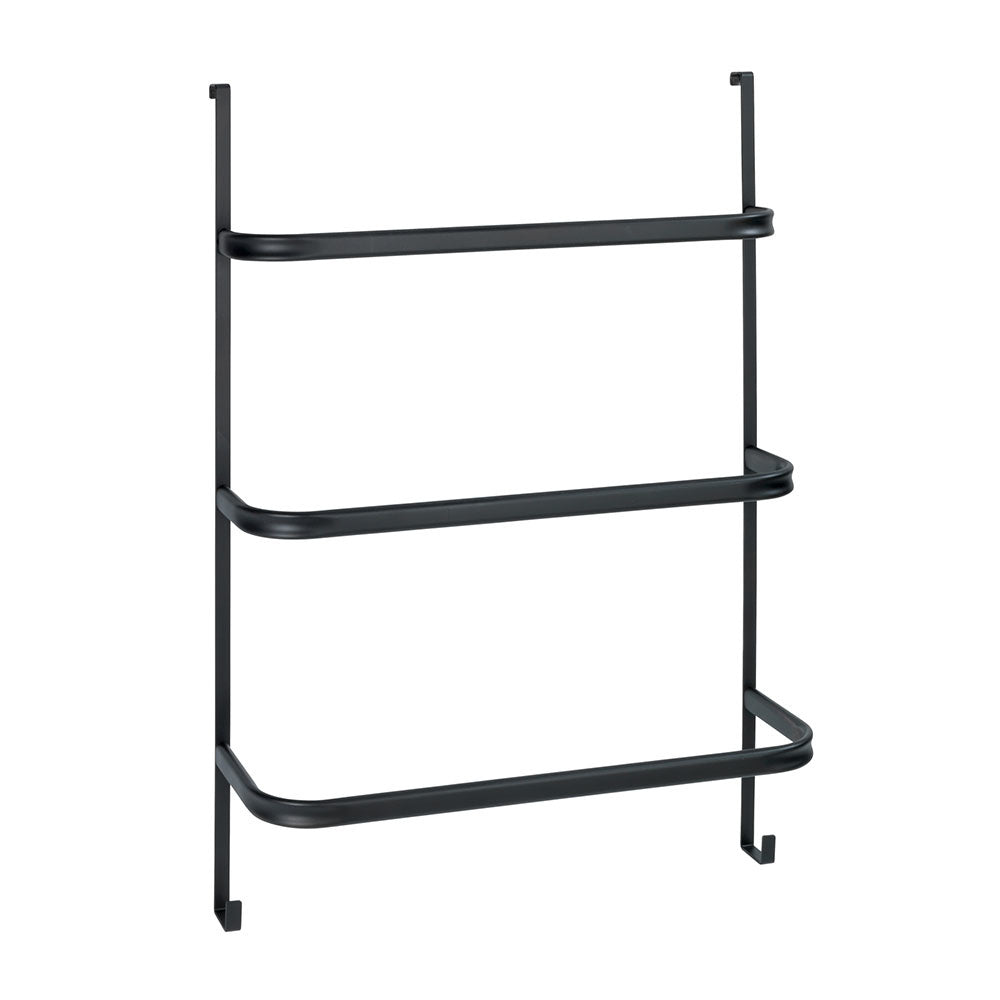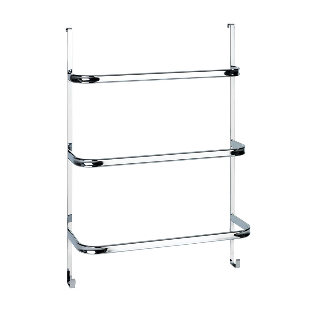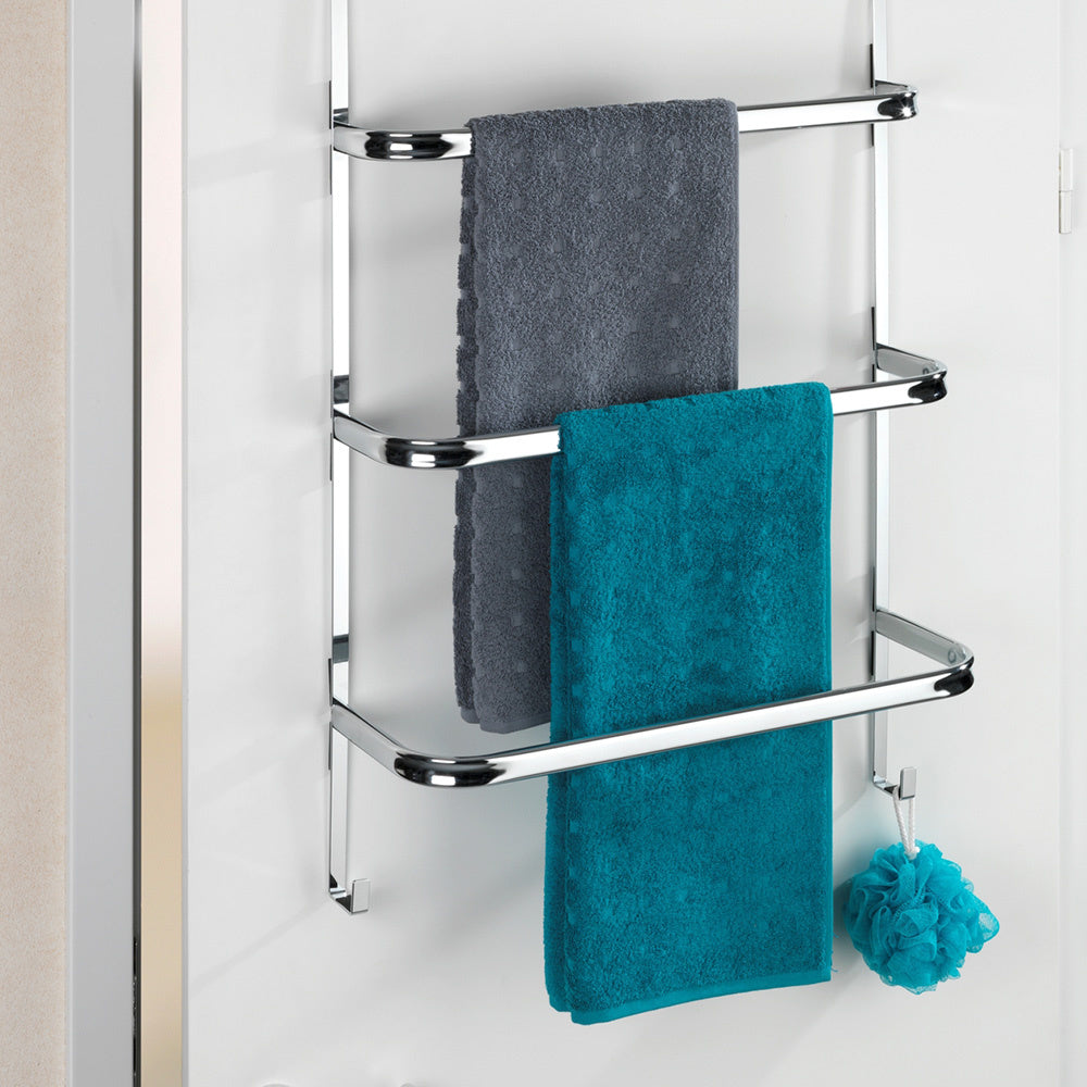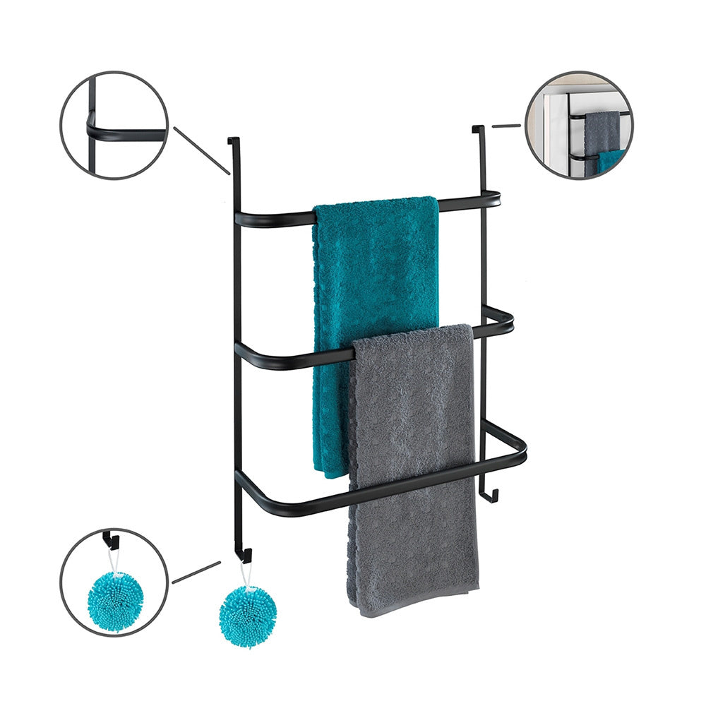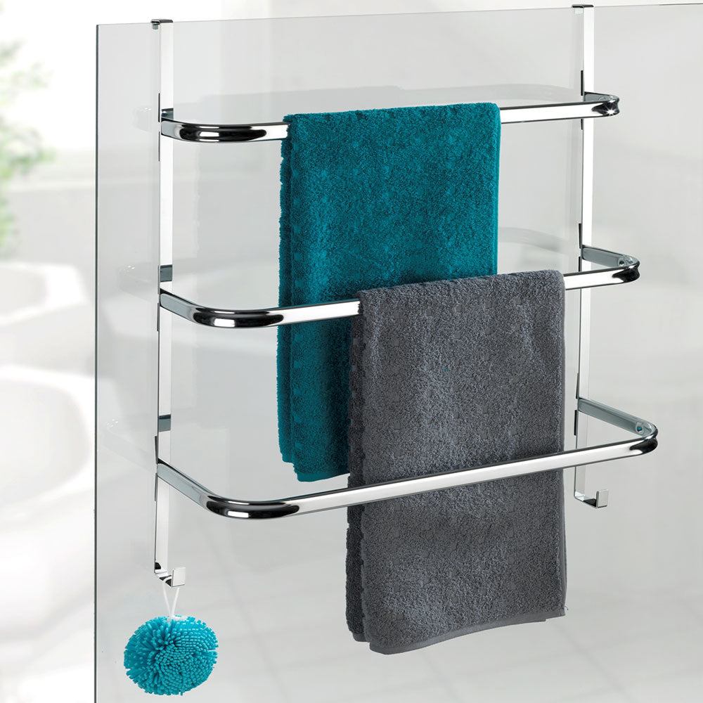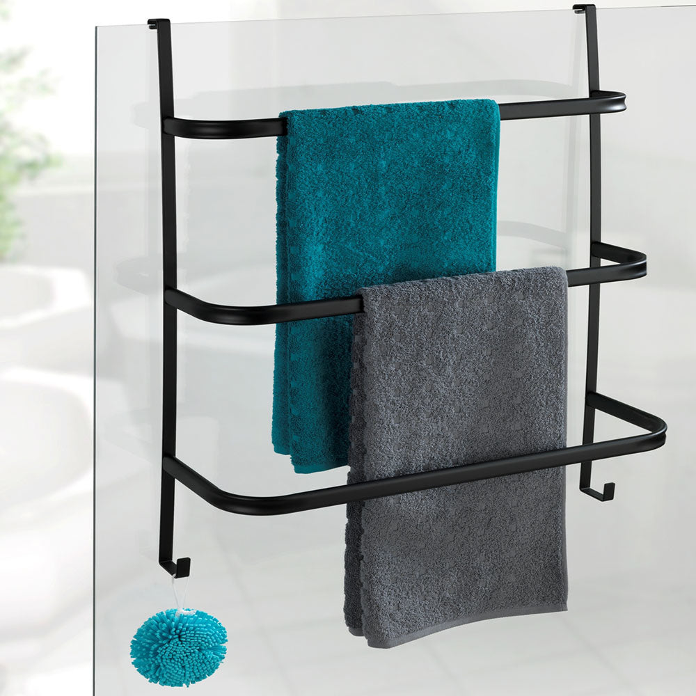 Dieser stilvolle Handtuchhalter für die Duschwand oder -tür kann ohne Bohren aufgehängt werden. Der Handtuchhalter hat drei versetzte horizontale Stangen und zwei Haken. Auf diese Weise nutzt du den Platz in deinem Badezimmer optimal aus.