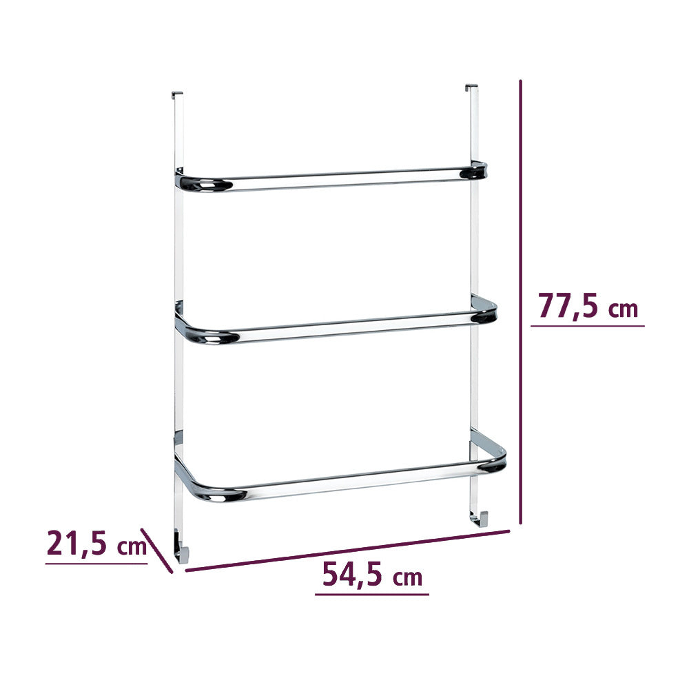 Dieser clevere Handtuchhalter für eine Duschwand kann auch für wandbündige Türen (Türdicke 2 cm) und flächenbündige Türen (Türdicke 4 cm) durch die unterschiedlichen Aufhängehaken genutzt werden. Das Regal ist aus hochwertigem, pulverbeschichtetem Metall gefertigt, extrem stabil und hat zudem ein schönes Design im Industire-Stil. Der Handtuchhalter ist 54,5 cm breit, 21,5 cm tief und 77,5 cm hoch.