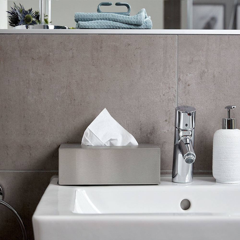 Wie bewahre ich meine Taschentücher auf? Kosmetiktuchschachteln aus dem Supermarkt oder der Drogerie haben oft einen bunten Aufdruck mit leuchtenden Farben. Das ist in deiner Einrichtung nicht immer willkommen. Außerdem bleiben Pappkartons durch Wasserspritzer und schmutzige Hände nicht lange sauber. Eine Kosmetiktuchbox aus Edelstahl, wie diese von Wenko, sorgt dafür, dass die gekaufte Box mit Taschentüchern nicht nur mit deiner Einrichtung harmoniert, sondern auch länger hält. Lege die Papierschachtel einfach in diese Kosmetiktuchbox aus Metall und verschließe sie mit dem Deckel.