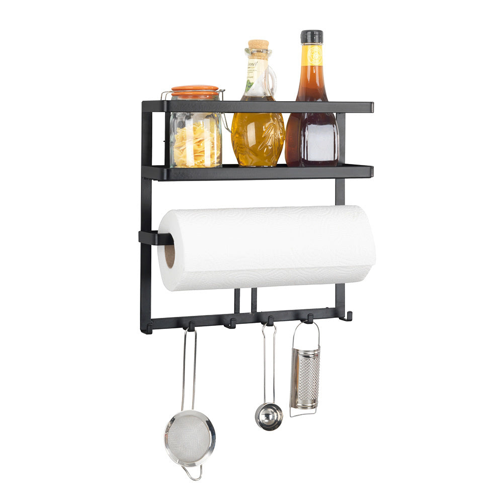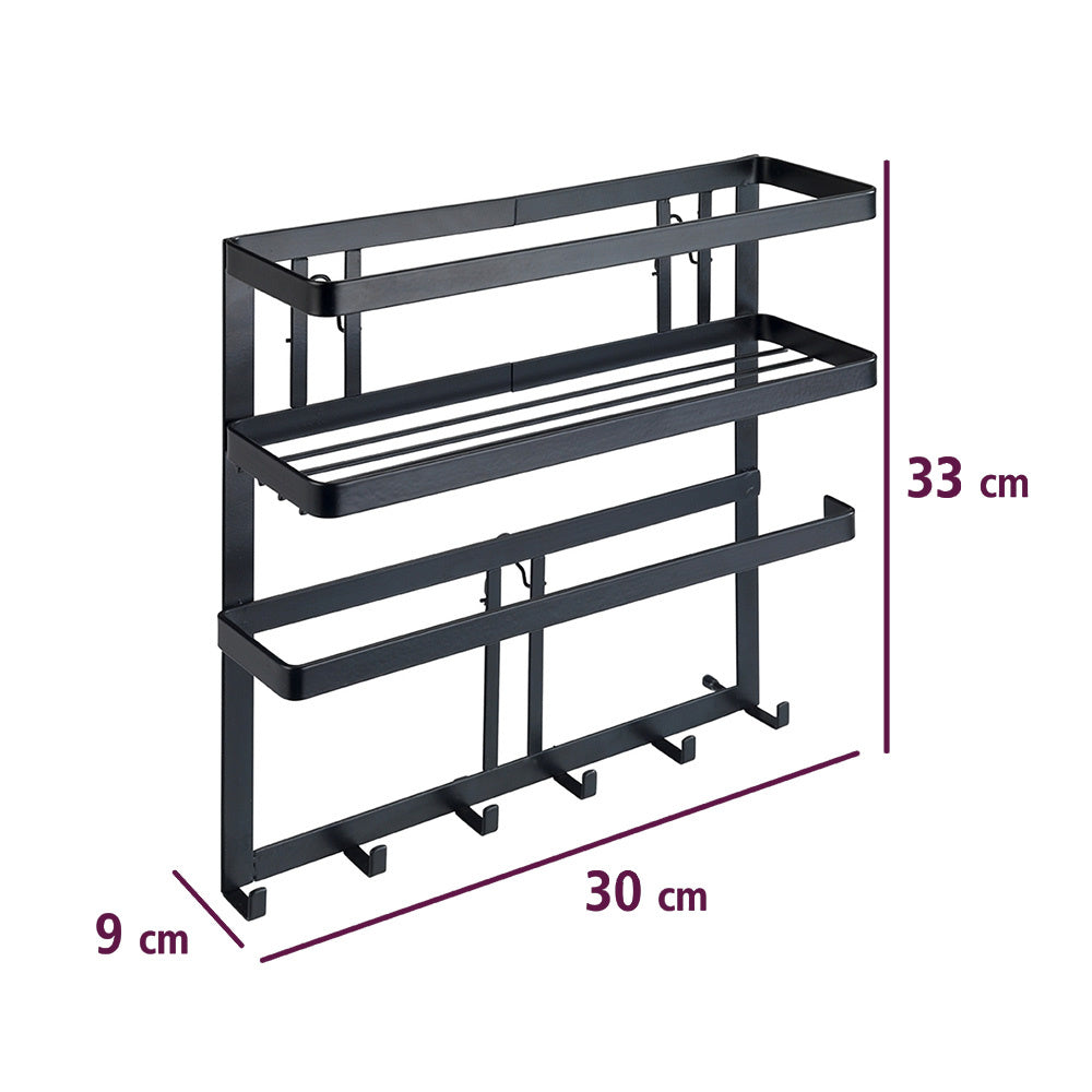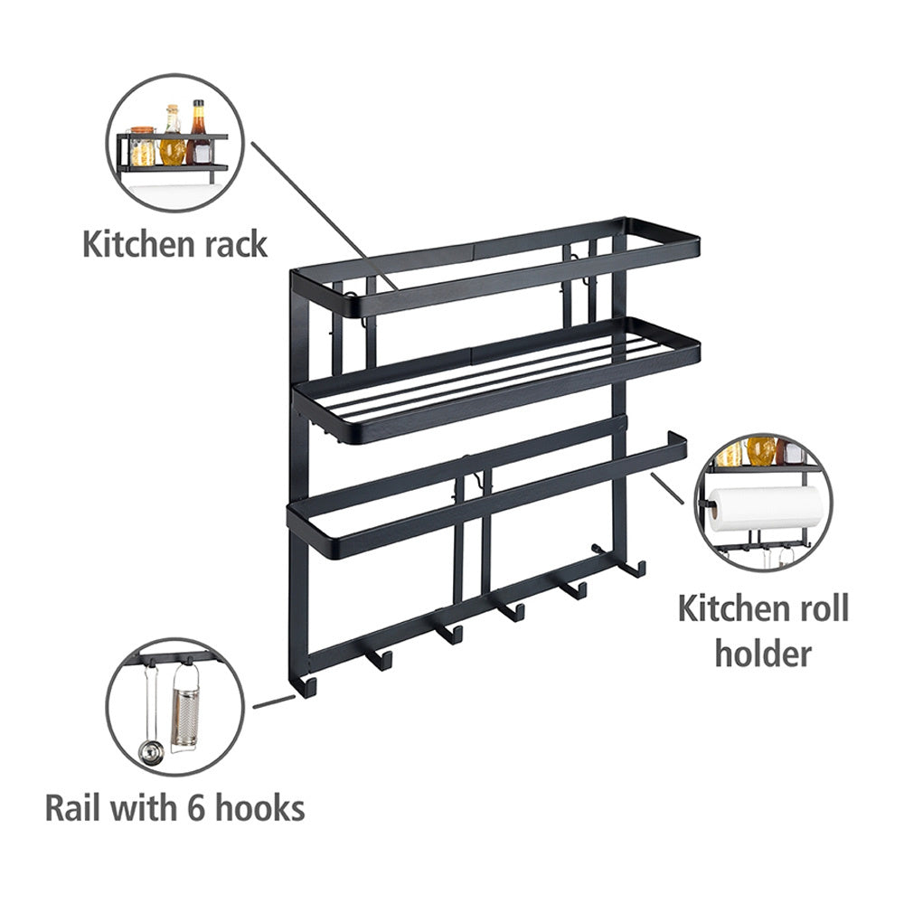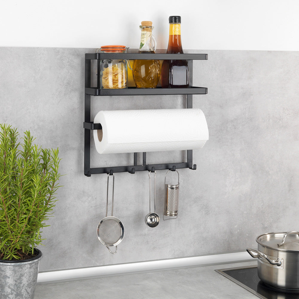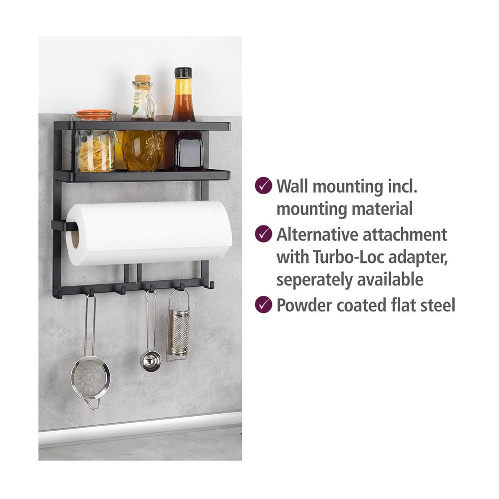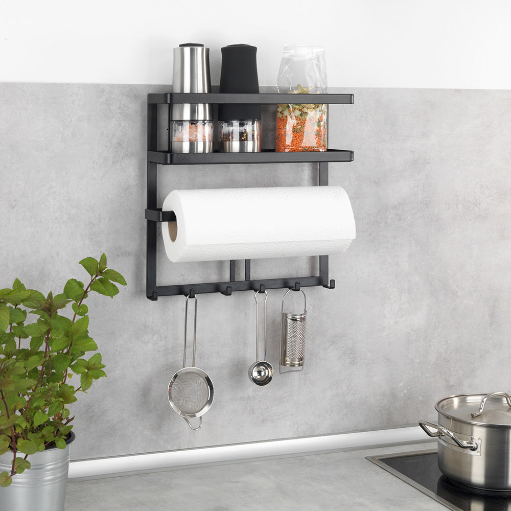 Mit diesem Küchenregal mit Küchenrollenhalter von Wenko erhältst du einen multifunktionalen Organizer mit einem Wandregal, einem Küchenrollenhalter und sechs Aufhängehaken.