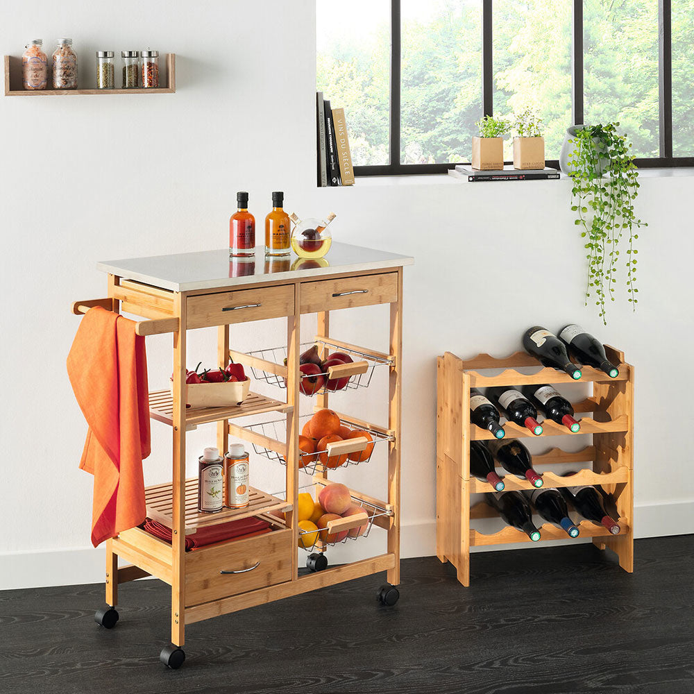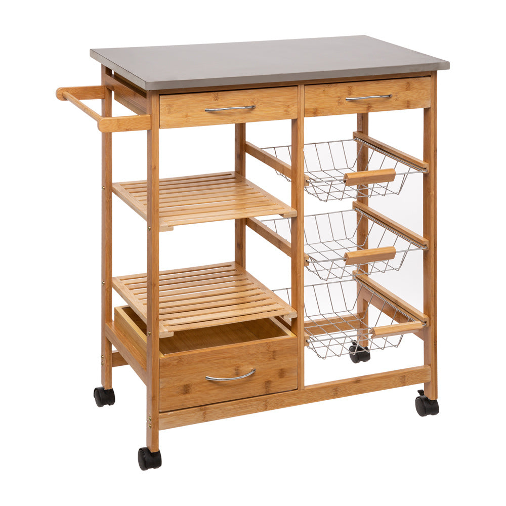 Der luxuriöse Küchenrollwagen ist aus Bambus gefertigt und bietet verschiedene Ablagemöglichkeiten. Der Küchenwagen aus Holz hat drei ausziehbare Körbe mit Griffen, drei Schubladen in zwei verschiedenen Größen und zwei Holzböden. An einer Seite befinden sich außerdem ein Griff und eine Bremse. Die vier Räder sind aus Kunststoff gefertigt. Insgesamt ist der Rollwagen aus Holz 73,5 cm breit, 37 cm tief und 86 cm hoch.