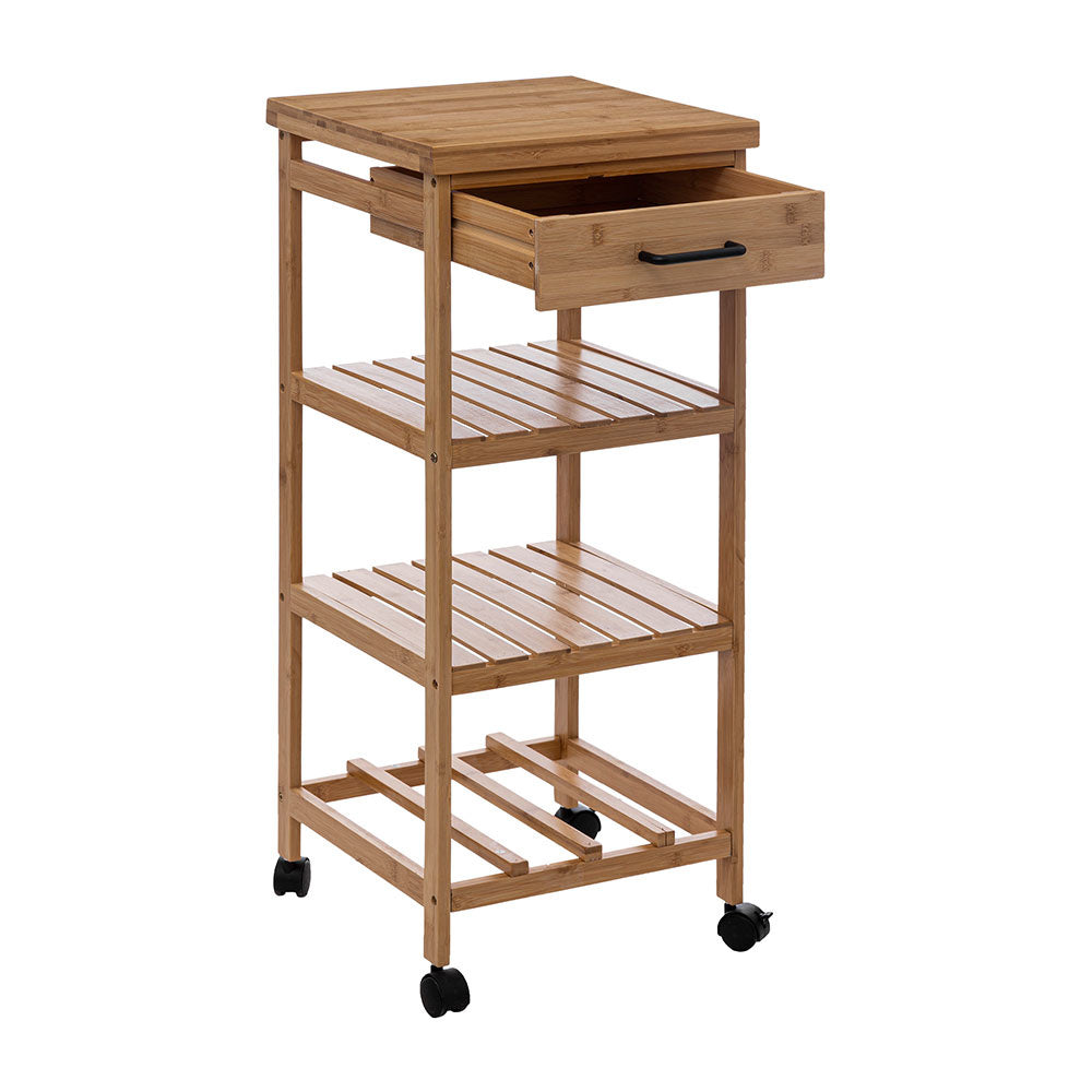 Dieser Küchenwagen mit Schubladen ist aus Bambus gefertigt und in natürlicher Holzfarbe zu kaufen. Die Abmessungen sind: