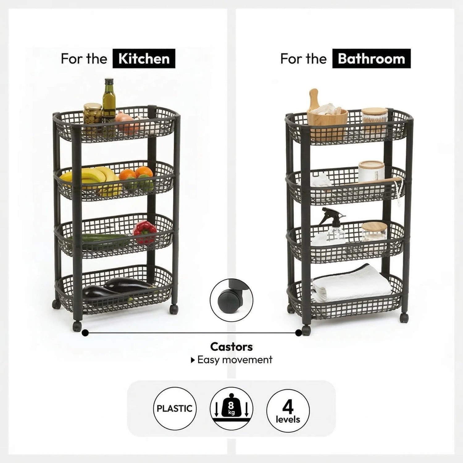 De vier opbergmanden bieden overzichtelijke ruimte voor verschillende producten, zoals fruit, keukenbenodigdheden, schoonmaakmiddelen of badkameraccessoires. Door de open mandstructuur blijft de inhoud goed zichtbaar en toegankelijk. Dankzij de wielen kun je de trolley eenvoudig verplaatsen tussen verschillende ruimtes in huis, bijvoorbeeld van de keuken naar de bijkeuken of badkamer.
