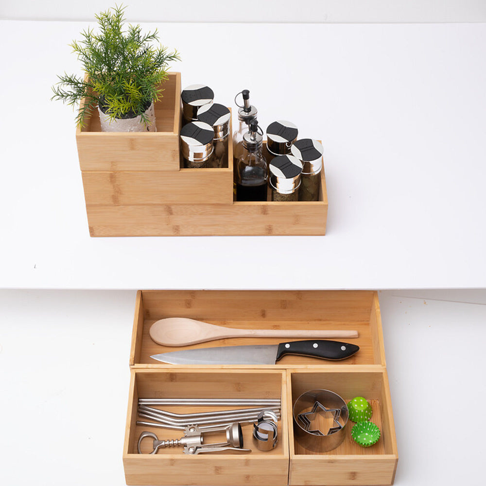 Diese praktischen Schubladenfächer von Five® bestehen aus drei Teilen. Man kann sie leicht übereinander, aber auch nebeneinander stapeln. Die Größe ist genau richtig, um die Holzkisten als Schubladen-Organizer zu verwenden. Wenn du auf der Suche nach Schubladen-Organizern bist, sei es für die Küche, das Bad oder einen anderen Raum im Haus, sind diese Schubladenfächer eine dauerhafte Wahl.