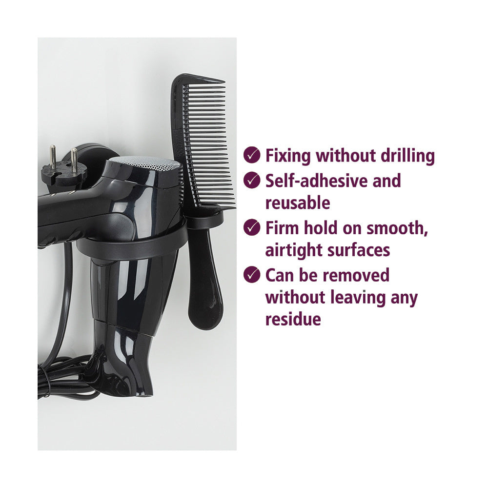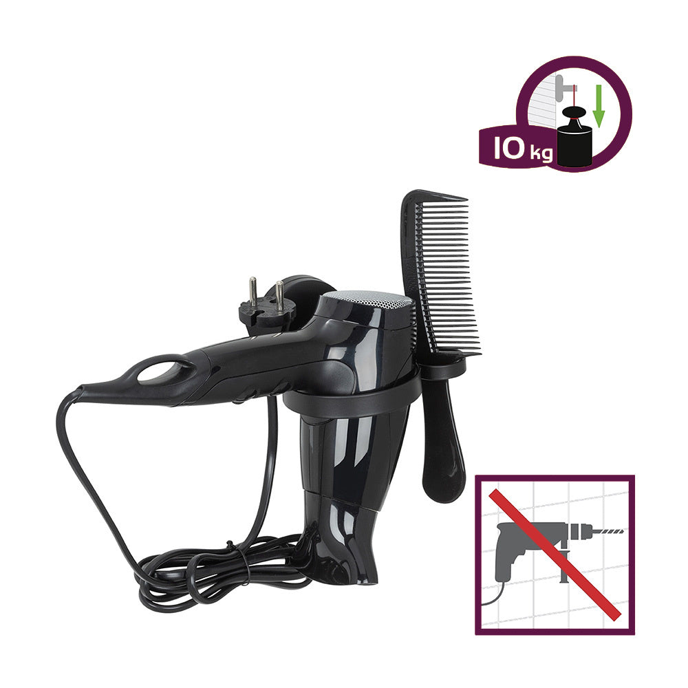 Dieser schwarze Föhnhalter von Wenko lässt sich ohne Bohren an der Wand befestigen. Neben einem Föhn kannst du auch eine Bürste oder einen Kamm in die Halterung stellen.