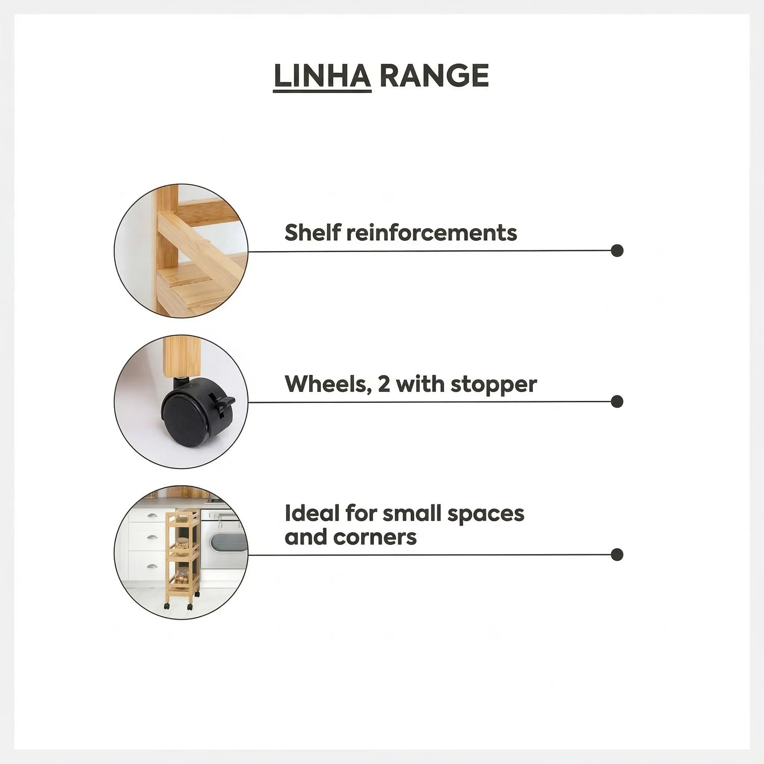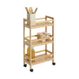 De trolley is gemaakt van bamboe en staat op vier kunststof wielen, waarvan twee met een rem zodat je hem veilig op zijn plaats kunt zetten. De drie open plankjes hebben een opstaande rand waardoor producten niet eenvoudig van het rek glijden. De verstevigde schappen zorgen daarnaast voor extra stabiliteit en maken de trolley geschikt voor dagelijks gebruik in huis. Dankzij het slanke ontwerp en de open structuur blijft alles overzichtelijk en gemakkelijk bereikbaar. De afmetingen zijn 45 cm breed, 22 cm diep en 80 cm hoog. Hoogte tussen de schappen is 27 cm en de trolley heeft een draaggewicht van 20 kg.