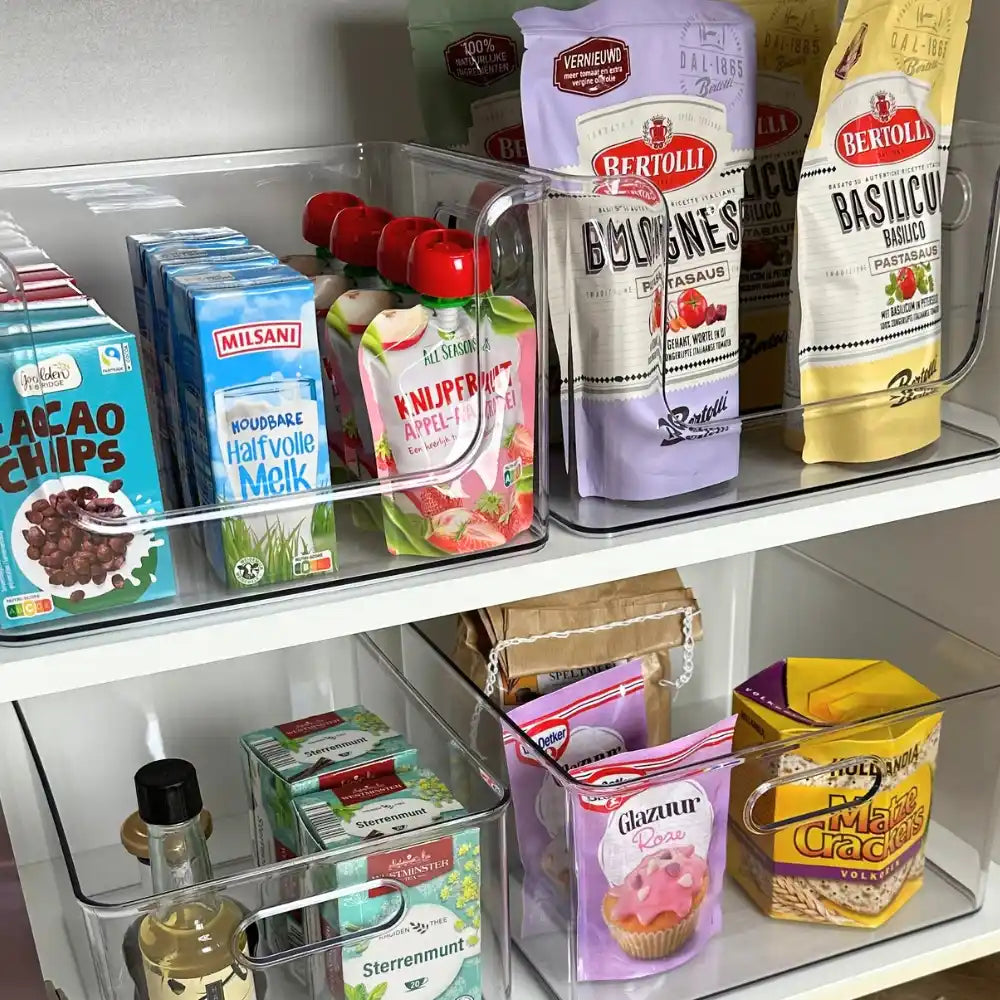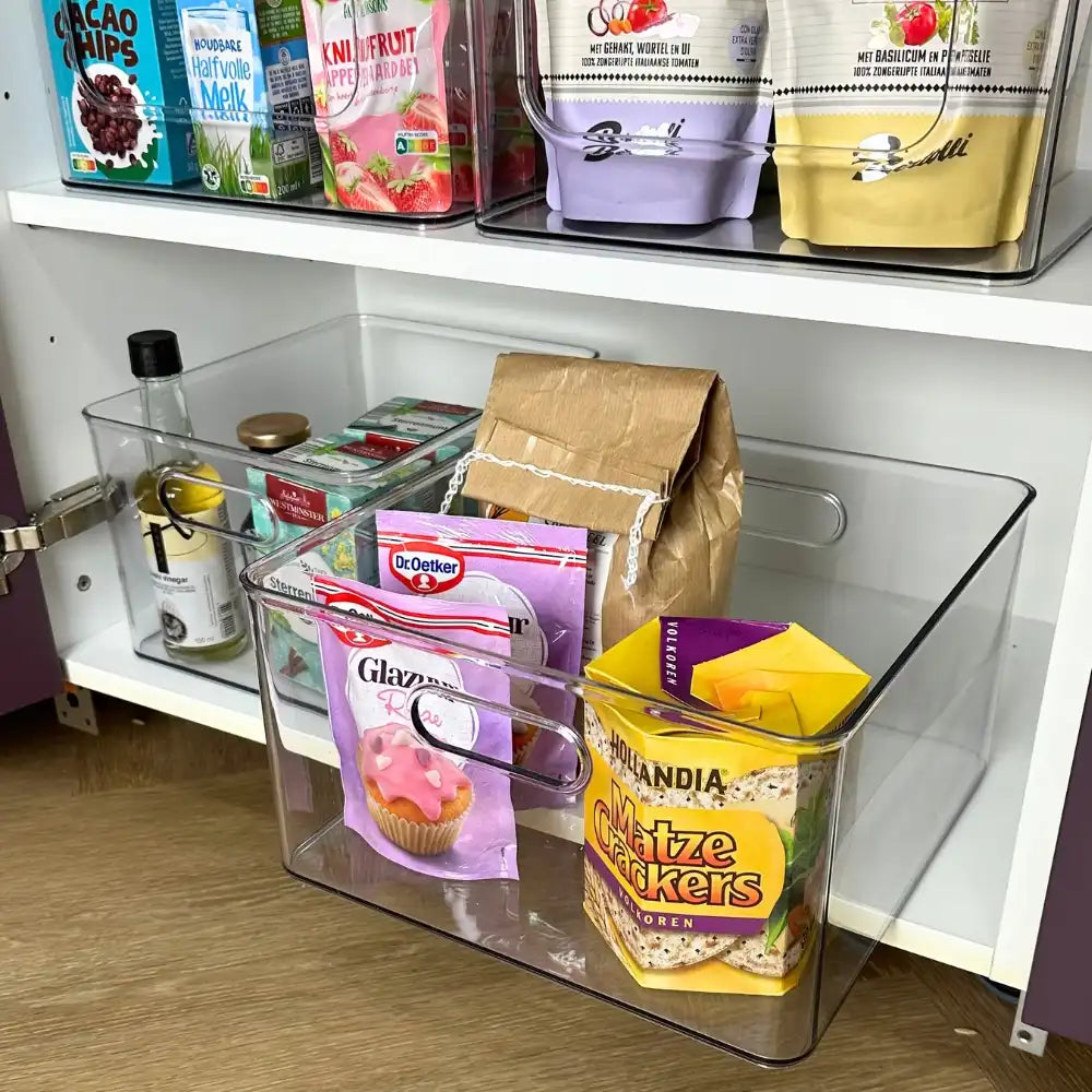 Dieser Aufbewahrungsbehälter aus ultraklarem, transparentem PET-Kunststoff ermöglicht es Ihnen, den Inhalt auf einen Blick zu erkennen. Dank des praktischen Griffs lässt er sich mühelos zu Ihnen heranziehen, sodass Sie Gegenstände, die sonst im hinteren Teil Ihres Küchenschranks verschwinden würden, sofort griffbereit haben. Ideal als Küchenschrankbehälter für Soßen, Gewürze, Backwaren oder Vorräte, aber genauso praktisch im Badezimmer für Körperpflegeprodukte und Kosmetik. Durch seine robuste Qualität eignet er sich auch für schwerere Gegenstände. Die abgerundeten Ecken verleihen dem transparenten Behälter ein elegantes, hochwertiges Aussehen und verhindern scharfe Kanten. Kombinieren Sie die verschiedenen Größen für eine effiziente, ordentliche und dauerhaft organisierte Schrankaufteilung. Verfügbare Größen:
