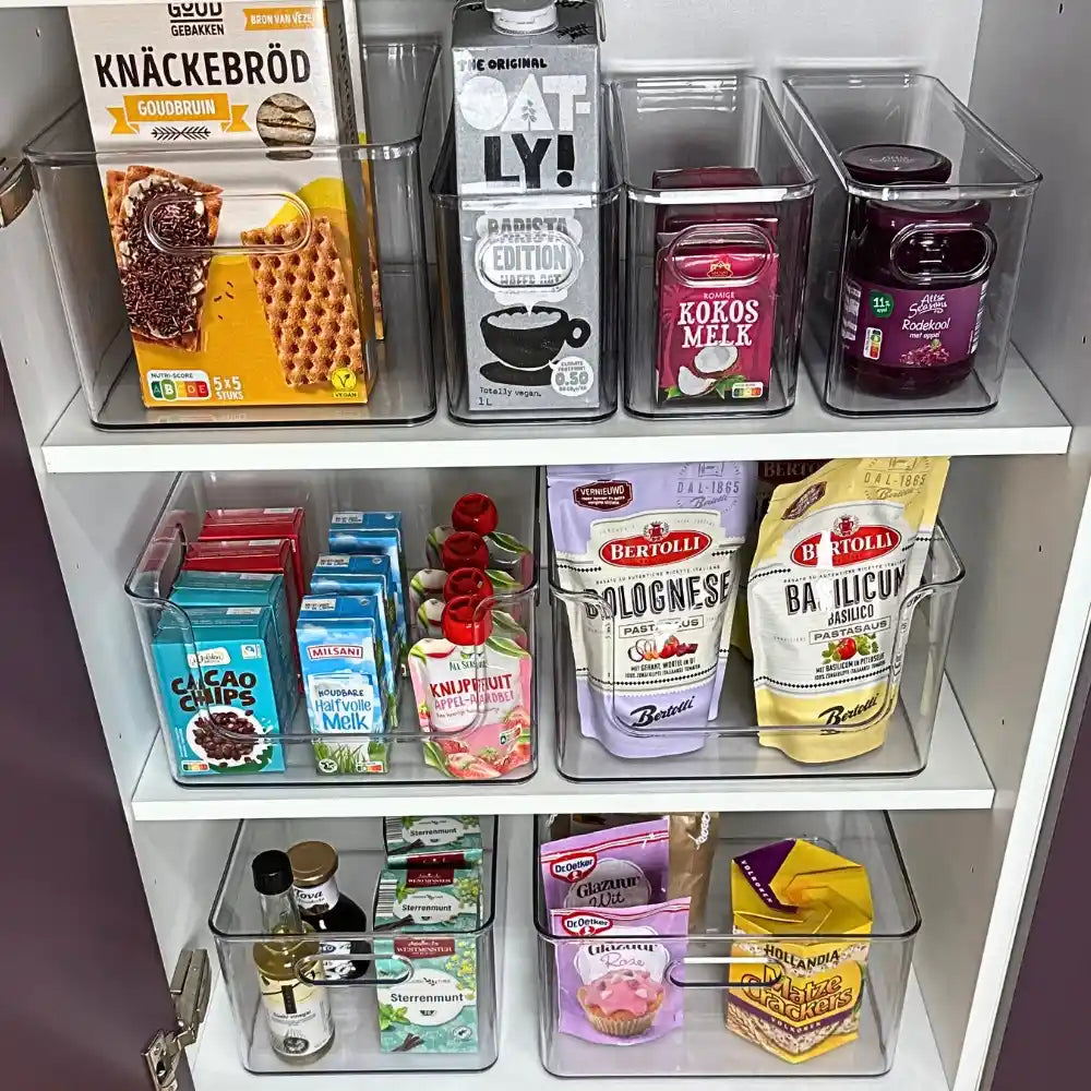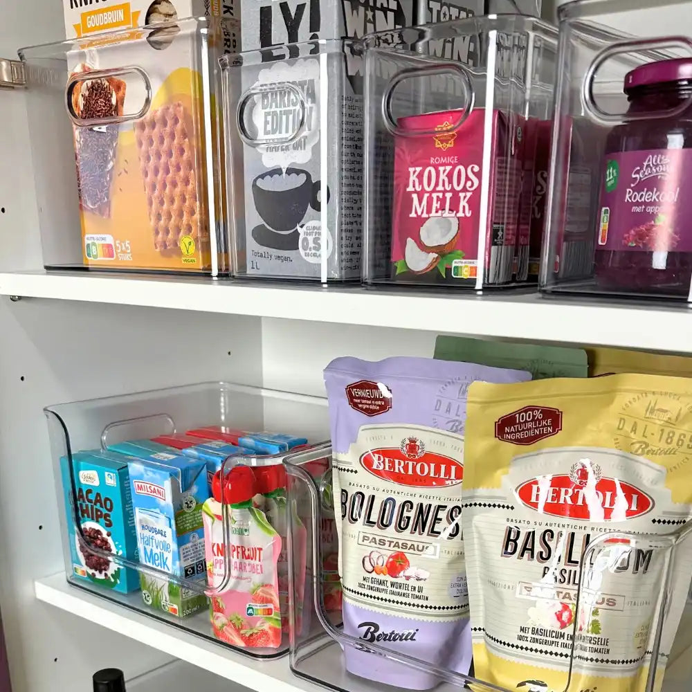 Dieser Aufbewahrungsbehälter aus ultraklarem, transparentem PET-Kunststoff ermöglicht es Ihnen, den Inhalt auf einen Blick zu erkennen. Dank des praktischen Griffs lässt er sich mühelos zu Ihnen heranziehen, sodass Sie Gegenstände, die sonst im hinteren Teil Ihres Küchenschranks verschwinden würden, sofort griffbereit haben. Ideal als Küchenschrankbehälter für Soßen, Gewürze, Backwaren oder Vorräte, aber genauso praktisch im Badezimmer für Körperpflegeprodukte und Kosmetik. Durch seine robuste Qualität eignet er sich auch für schwerere Gegenstände. Die abgerundeten Ecken verleihen dem transparenten Behälter ein elegantes, hochwertiges Aussehen und verhindern scharfe Kanten. Kombinieren Sie die verschiedenen Größen für eine effiziente, ordentliche und dauerhaft organisierte Schrankaufteilung. Verfügbare Größen: