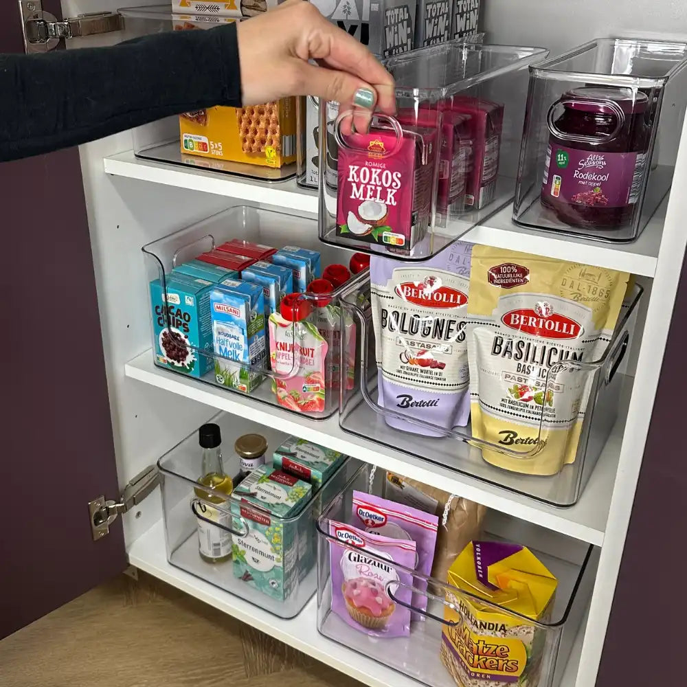 Dieser Aufbewahrungsbehälter aus ultraklarem, transparentem PET-Kunststoff ermöglicht es Ihnen, den Inhalt auf einen Blick zu erkennen. Dank des praktischen Griffs lässt er sich mühelos zu Ihnen heranziehen, sodass Sie Gegenstände, die sonst im hinteren Teil Ihres Küchenschranks verschwinden würden, sofort griffbereit haben. Ideal als Küchenschrankbehälter für Soßen, Gewürze, Backwaren oder Vorräte, aber genauso praktisch im Badezimmer für Körperpflegeprodukte und Kosmetik. Durch seine robuste Qualität eignet er sich auch für schwerere Gegenstände. Die abgerundeten Ecken verleihen dem transparenten Behälter ein elegantes, hochwertiges Aussehen und verhindern scharfe Kanten. Kombinieren Sie die verschiedenen Größen für eine effiziente, ordentliche und dauerhaft organisierte Schrankaufteilung. Verfügbare Größen: