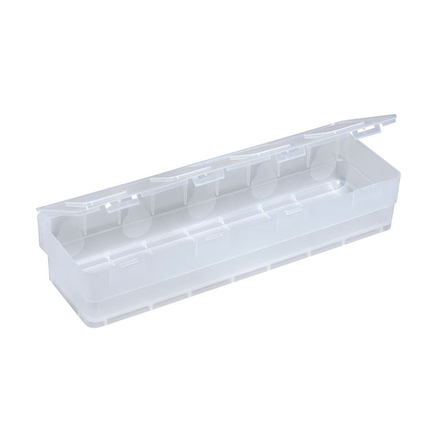 Diese transparente Allit- Box besteht aus Kunststoff und verfügt über einen Deckel mit sicherem Schnappverschluss. So wird verhindert, dass kleine Schrauben auf den Boden fallen. Dank ihres schlanken Designs ist sie eine praktische Ergänzung für die Werkstatt, eignet sich aber auch perfekt für den Einsatz zu Hause. Die erhöhten Flächen an Deckel und Boden ermöglichen zudem ein sicheres Stapeln.