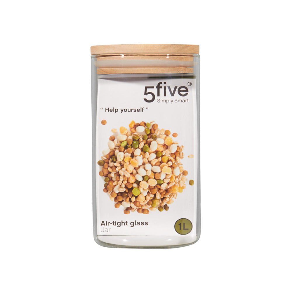 Die Glasvorratsbehälter von Five® haben einen schönen Holzdeckel, der für einen rustikalen Look in Deiner Küche sorgt. Dank des Gummirands am Deckel ist der Vorratsbehälter luftdicht verschlossen und kann Deine Lebensmittelvorräte länger frisch halten. Die Vorratsgläser mit Holzdeckel sind von robuster Qualität und in zwei verschiedenen Größen erhältlich: