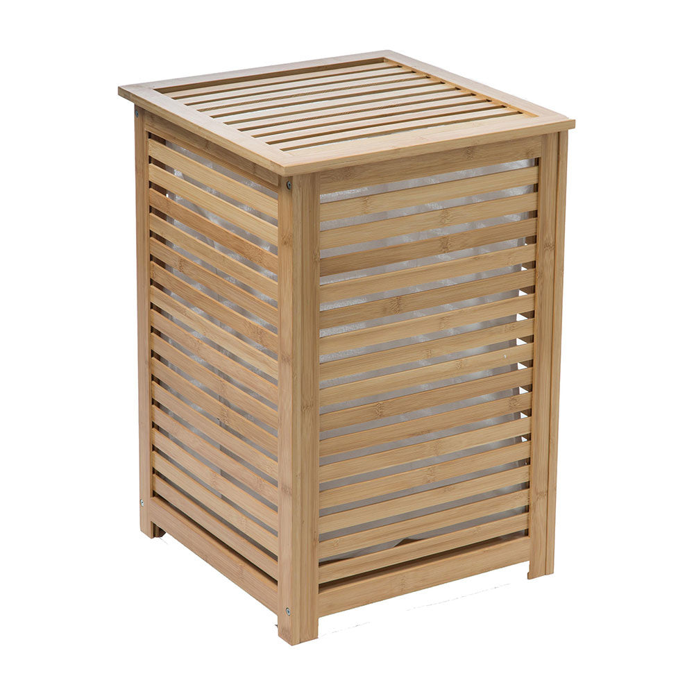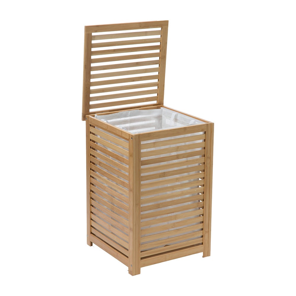 Der Wäschesammler aus Bambus hat eine Innentasche die aus einem Segeltuchmaterial gefertigt wurde. Das Fassungsvermögen dieses Korbes beträgt 65 Liter. Der Korb ist in zwei Größen erhältlich: 65-Liter-Korb mit einer Innentasche und 100-Liter-Korb mit zwei Innentaschen. Die Abmessungen sind: