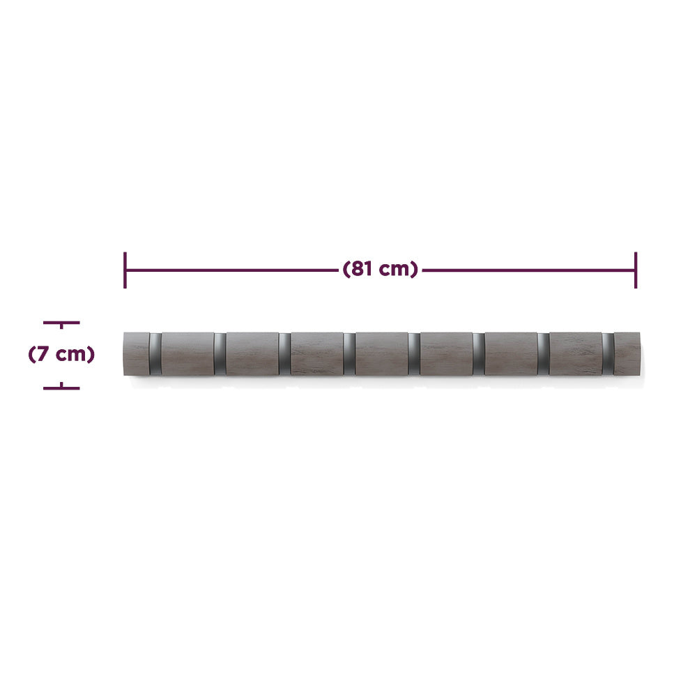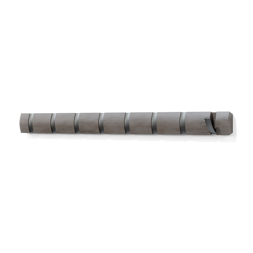 Der UMBRA-Garderobenständer ist in zwei Größen erhältlich: mit 3, 5 oder 8 Kleiderhaken. Der Wandgarderobenständer ist aus Holz, die Kleiderhaken aus Metallguss gefertigt. Jeder kann 2,3 kg tragen. Das Befestigungsmaterial und eine Anleitung zur Befestigung sind im Lieferumfang enthalten.