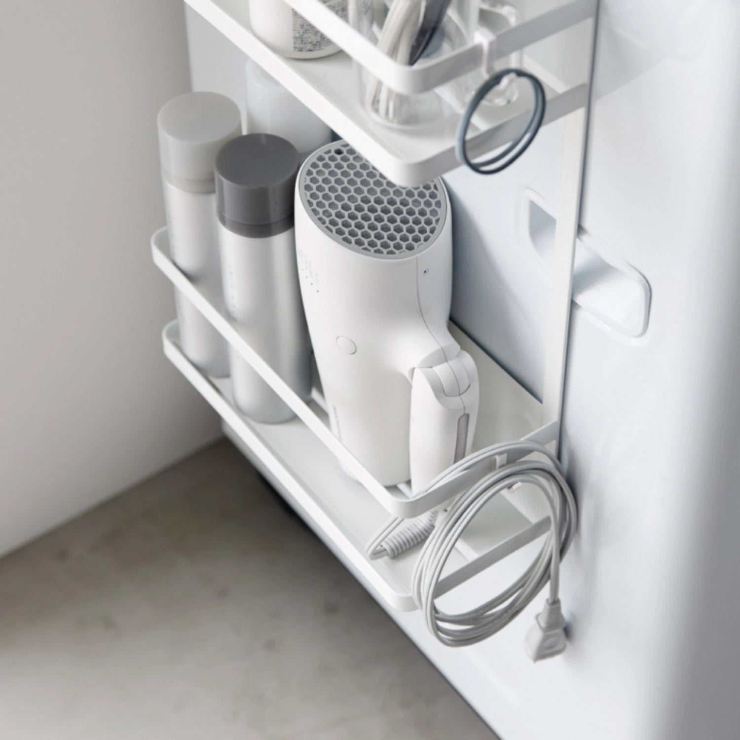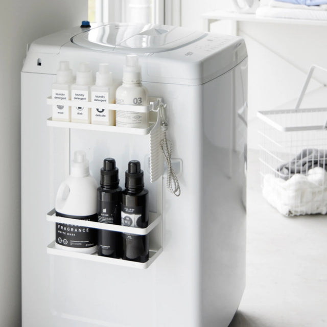 Dank seines vertikalen Designs nutzt dieses magnetische Waschmittelregal den Platz um die Waschmaschine herum optimal aus. Die Kombination aus Ablagen und Haken ermöglicht es, verschiedenen Produkten einen festen Platz zuzuweisen. Das Regal ist flexibel einsetzbar und eignet sich sowohl für Waschküchen als auch für Badezimmer.