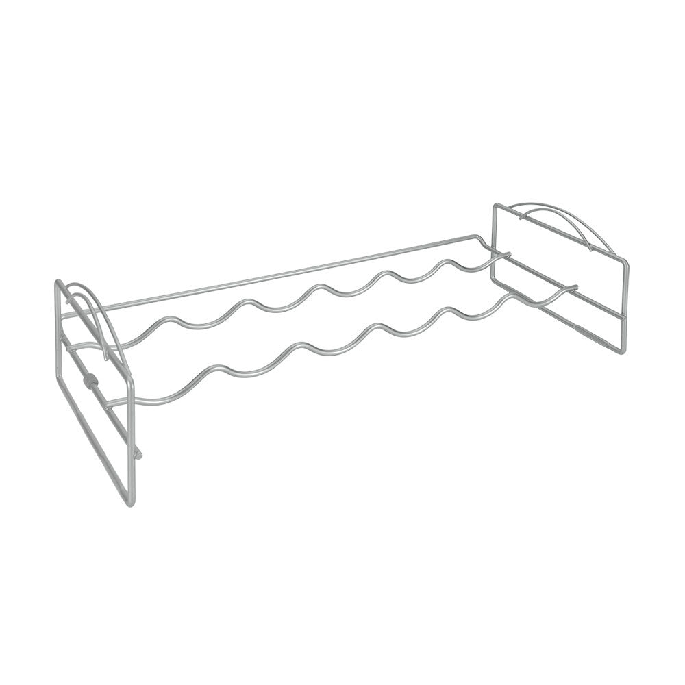 Das stapelbare Weinregal besteht aus Metall und hat eine silberne Farbe. Es wiegt nur 0,7 kg. und hat die Maße: 56 cm breit, 25 cm tief und 13 cm hoch.
